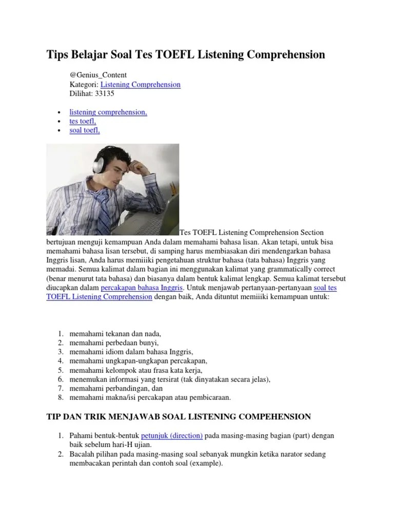 Listening dalam tes toefl bertujuan untuk menguji kemampuan dalam memahami bahasa lisan. Part 1 pada part 1 ini anda akan . Below is an example of what you'll hear during the listening section of the test. Juga berisi audio listening section 2014 supaya soal dan transkripnya sambil dengerin audionya. Audionya bisa langsung didengarkan di website .