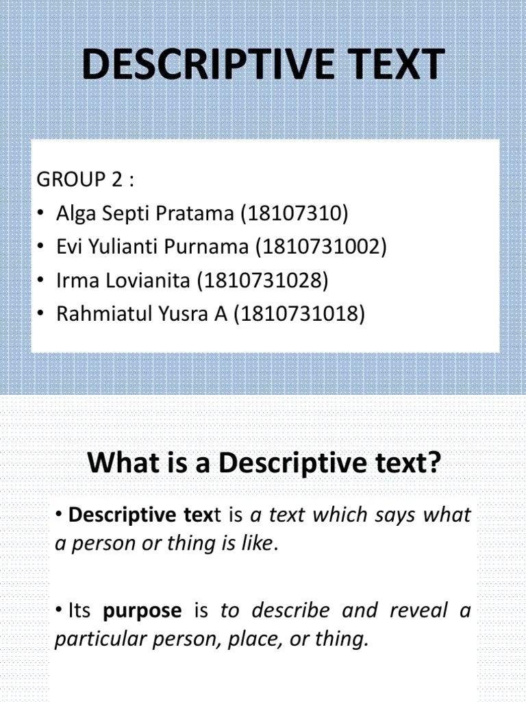 To describe tugu muda monument. To tell about an interesting place in semarang. Descriptive text bertujuan mendeskripsikan dan mengungkap orang, . To describe the writer‟s new bag. Dimana telah dijelaskan dengan panjang lebar apa dan bagaiaman teks ini ditulis.